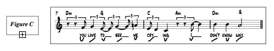 Moreover, the quarter note triplets from the first and second A in “Figure A” highlight how she devotes the same three unstressed syllables in both sections. Then, her stressed syllable on the lyric “mean” and in the following “say,” sound incredibly emphatic and intentional. There is really no way that she could have stressed these stressed words in a more musical manner.