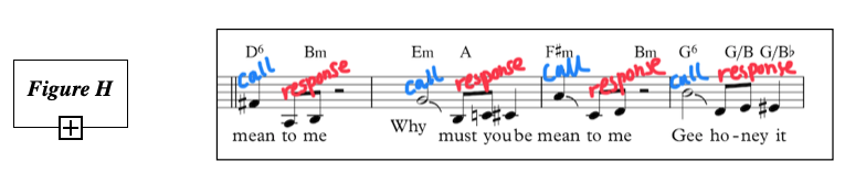 Billie Holiday takes many liberties with the melody in her performance. She largely ignores the melodic contour of the A sections where one starts with a high note as sort of a call and then the response is the leap down to the 2 or 3 adjacent notes. “Figure H” shows how Etting does this in a manner that matches the original sheet music: