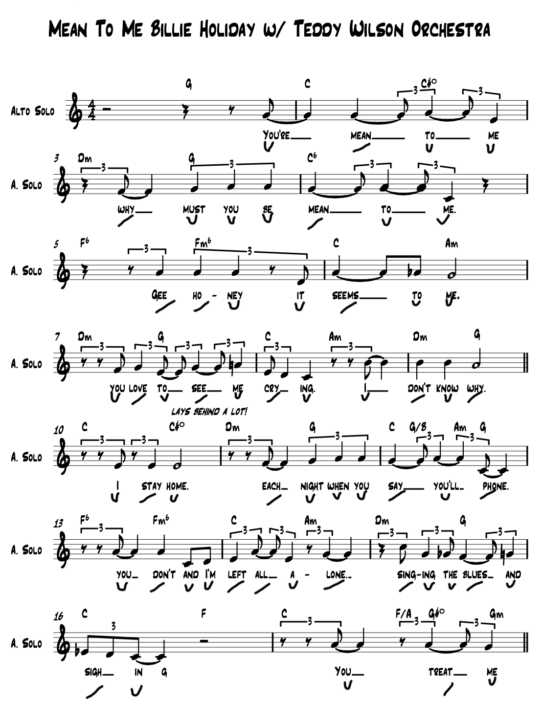 Vocal phrasing differs from instrumental in that there are lyrics, so a musical analysis of “Mean To Me” might warrant a system of scansion. This is a system commonly used in poetry to determine the natural rhythm of a line by analyzing stressed and unstressed syllables typically to place into a meter. In my opinion, it is appropriate to use a similar analysis as singing is an oral tradition just like poetry. Now, one could technically stress whichever word one would like while reading out loud. However, to figure out stress and meaning in scansion, one would focus on inflection and elongation of vowels. I attempted to do so in the most neutral way, and in this song with its ample use of pronouns it is worth noting that pronouns are rarely stressed unless for emphatic effect. Also, while one reads out loud it is almost impossible to stress a pronoun without increasingly stressing the verb following. A great example would be line 4. While one might want to stress “you” it is almost impossible to stress it more than the following verb, so therefore I concluded “you” is unstressed in the context of the following verb “love.” Throughout the song, there seems to be a pattern of a stressed syllable followed by an unstressed throughout. There are, however, a few sections where there are two or three consecutively stressed syllables or unstressed syllables, such as lines 2,7 and 15. I placed this “neutral” scansion over the transcription of Etting and Holiday to compare in what ways they were bringing forth the lyric. This way I could compare who is placing the natural stresses of the lyric in a musically stressed position. (I consider a musically stressed position a downbeat, and I particularly consider beat 1 to be the most musically stressed position.) (Scansion is placed in context of the two separate transcriptions at the end of the article).